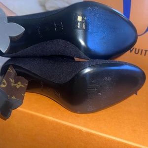 This is an authentic pair of LOUIS VUITTON Monogram Stretch Fabric Silhouette Ankle Boots Size 41 in Black. This unique and chic boot is made of black fabric and features a Monogram 3.1 inch heel in the shape of a monogram fleur. This size is no longer is stores and will not be replaced. I wear bigger size but they did not have my size so I got these anyways only once for an hour at casino and figured they are too small.