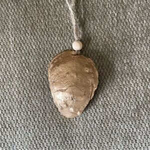Handmade, customized Oyster Shells from St George Island, FL. Glazed with a clear & protective coating, adorned with a gold leaf edge and accent bead. Twine Tie.