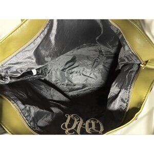 This elegant olive green tote bag features a monogram design, offering a sophisticated touch to any outfit. The floral strap adds a stylish accent, while double handles provide versatility for carrying. It's designed for everyday use, with ample space for your essentials, making it an ideal accessory for work or leisure. Gold-tone hardware. Approx. size 13.5" W x 11" H x 5.5" D x 10" Handles drop x 21" Shoulder strap drop.