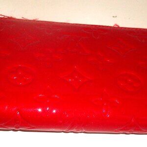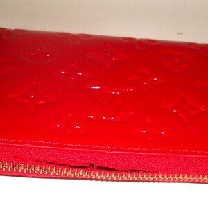 A red vinyl monogrammed zip-around ckutch wallet with 7 bill-long compartments inside - one with top zipoer and 6 card slots. In good hsaore with ff wear: 4" tear in fabric part of zipper - zipper works fine --and mark on one side of exterior.DImensions: Length L 8" H 4" D1" NOT LOUIS VUITTON