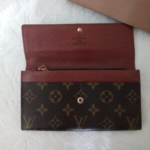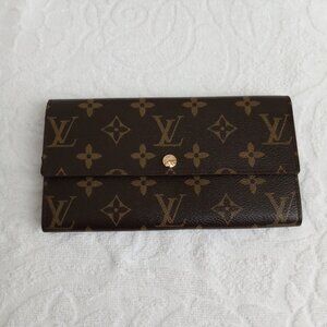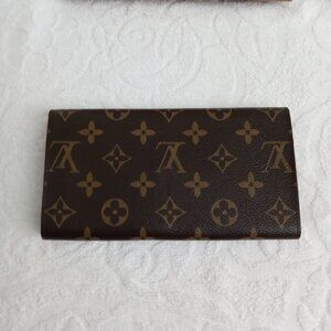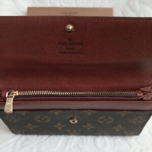 Another purchase I forgot I had. New and unused. Beautiful monogrammed long wallet with two full-length slash pockets, a zippered full-length pocket, and two small slash pockets under flap with snap closure. Measures 7.25" x 4" x 0.9". Comes with dust bag in original box.
