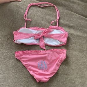Pink bikini with blue monogram: BKN middle letter for last name has a slightly bigger font (initials for BNK)