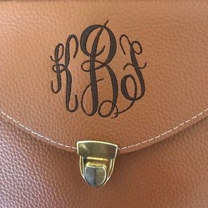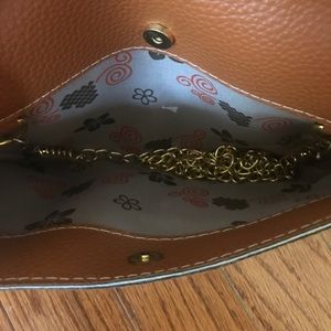 Tan leather clutch with brown embroidered lettering. Gold chain included to wear on the shoulder or as a cross-body bag. Very gently used.