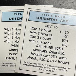 This is a Monopoly Classic Oriental Ave Property Title Deed Card Replacement. Enjoy the classic game of Monopoly in modern style with this replacement card. Perfect for those who have lost or misplaced their original card, or who simply want to extend the life of their game. With this replacement card, you'll be able to continue your game for years to come.