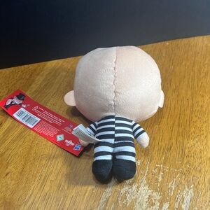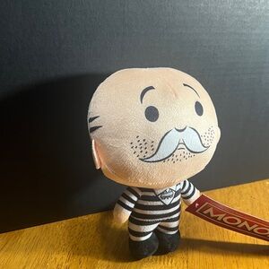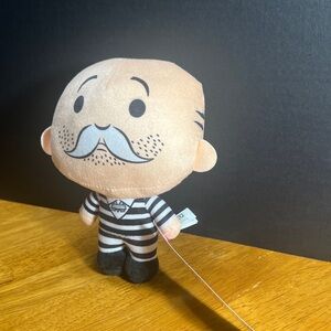 Hasbro Monopoly Man "Jail Bird" Chibi-style plush toy, featuring the iconic character in a black and white striped prison outfit.