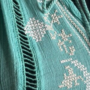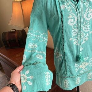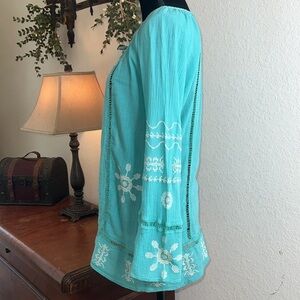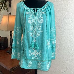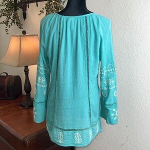 Monoreno | Cotton Gauze Cross-stitch Ladder Lace Tunic Top | Size Medium. This top is in excellent condition. The Crosstitch is so pretty on this blouse. I love the ladder lace detailing. It is very lightweight, but not see-through. This tunic is perfect for warm weather. See pictures for measurements.