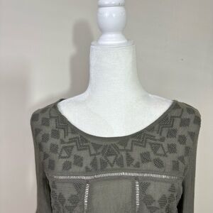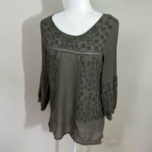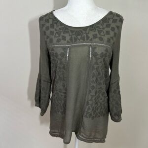 Nice lightweight tunic with a gauzy feel with lots of embroidery on the upper front and the sleeves have a gathered section from the elbow to wrist with the tone on tone embroidery also. Measurements are pit to pit flatfold about 18”. The length from the top of the shoulders to front bottom about 26” and the center back is about 3” longer No visible flaws. Any questions please ask and we.will answer questions ASAP. O