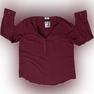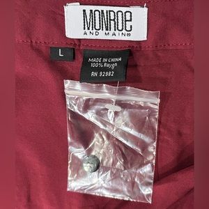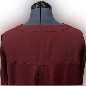 Monroe & Main burgundy tunic in a size large. New without tags, this top has a loose fit, three button opening at the top of the shirt, button closure on sleeve cuff and is made from 100 percent rayon. This lightweight top will look great dressed up or down with your favorite leggings, jeans or dress slacks.
