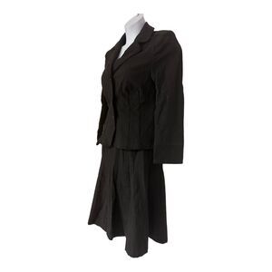 Black on black stretch jacquard (not super stretchy, just comfortable), unlined, mid to light weight for year round wear indoors. It is primarily a fall and spring weight item. See photos for content and care. Jacket features notch collar, three button front, fitted bodice, lightly padded shoulders, bracelet (wrist) length sleeves. Skirt is below the knee or midi length depending on your height. It has a 2" banded waist, goring, wide A-line cut, almost fit and flare silhouette.