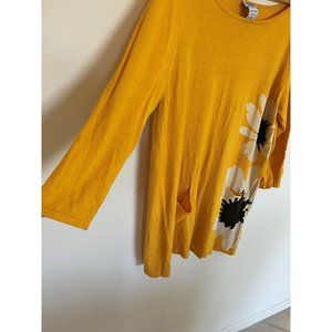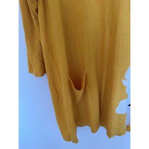 Sunny Yellow floral, front and back, 2 big pockets front, viscose, nylon. Machine Wash.Pull over head. 22" arm pit to arm pit. 34" shoulder to hem. 3/4 sleeve.