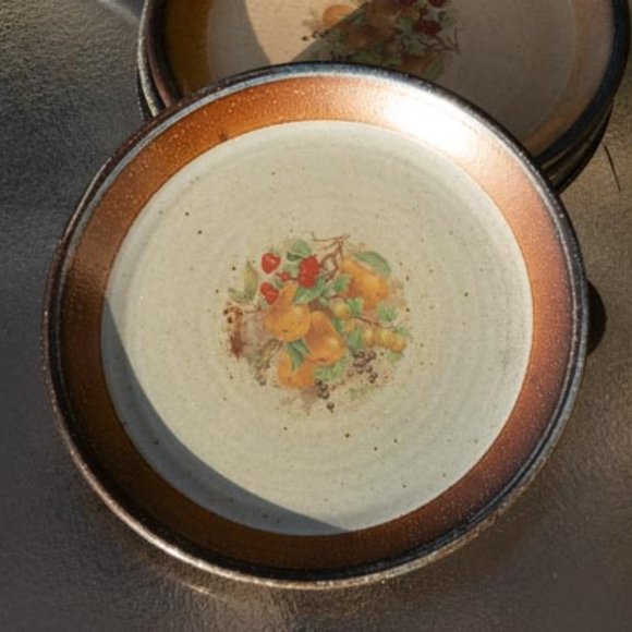 In excellent vintage condition, one Monroe Salt Works Pears and Strawberries Large Dinner Plate 11". It is a bit grayish and dark brow, with blue lip, very pretty plate. No stamps nor any branding.
