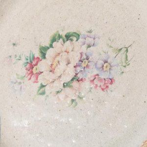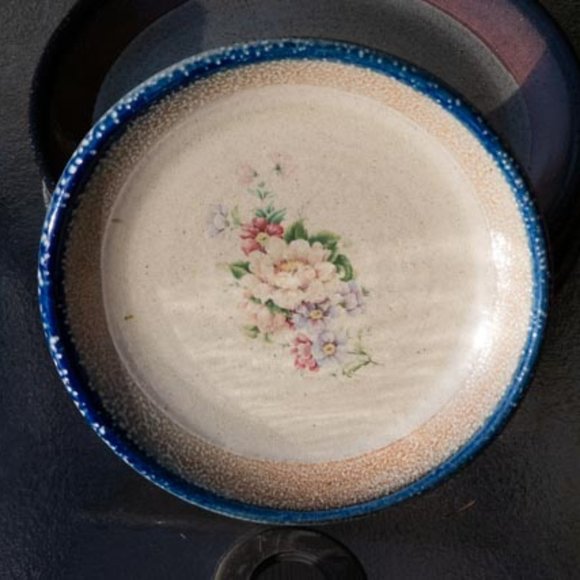 In excellent vintage condition, one Monroe Salt Works Pink Flower Large Salad Plate with 8.5" diameter. The plate is grayish tan at the well, tan lip and dark blue rim. It has MSW etched on its bottom.