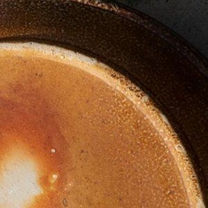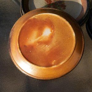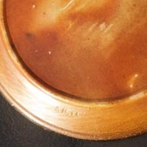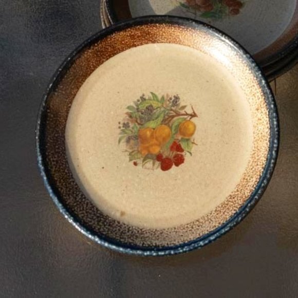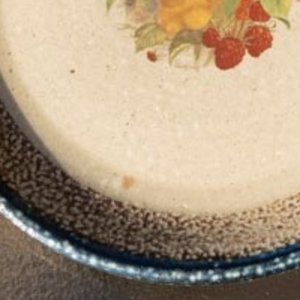 In excellent vintage condition, one Monroe Salt Works Raspberries, Blueberries and Apricots Large Dinner Plate 11". Tan color with marbled brown edge and dark blue edge.