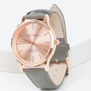 Brand New…Beautiful Rose Gold and Gray Leather Wristwatch, Iconic classic Design very Stylish, Monroe' Sunburst Sole'rose, Button Cell Battery, Three-hand Quartz movement, includes Dust Bag, Watch face:36mm, Upper Strap length: 75mm(without buckle/clasp) Lower Strap length:115mm, Water resistance, smoke and pet free home, Fast Shipping.
