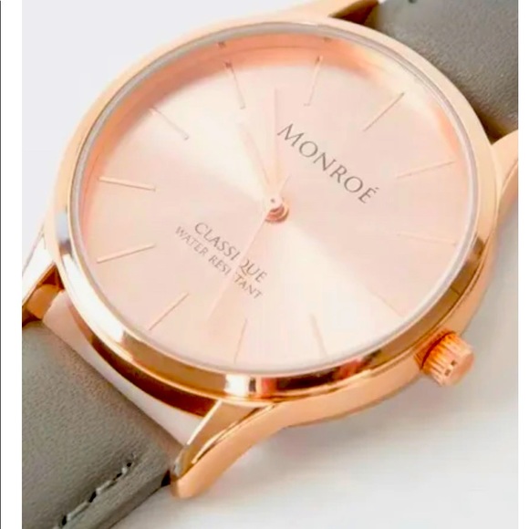 New without tags Monroe Classique watch. Never worn grey genuine leather water resistant band with rose gold face.