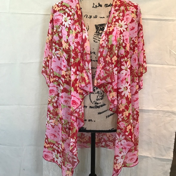 Beautiful pinks and red floral print. Sheer jacket or use as a cover up at the beach. Ivory color fringe hangs from the bottom giving it that vintage look.