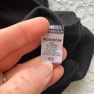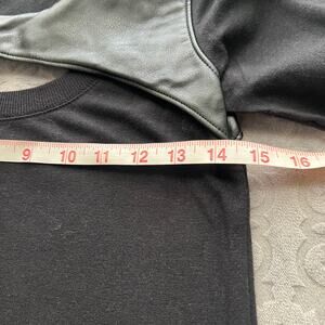 Monrow Black Long Sleeve Supima Dress XS. Preowned and in great condition. Dress has opening on front and back at top of chest. Leather at top of dress. Knee length and long sleeve. Please see all photos. Approx measurements in pictures.