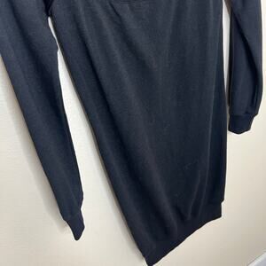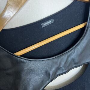 Monrow Black Long Sleeve Supima Dress XS. Preowned and in great condition. Dress has opening on front and back at top of chest. Leather at top of dress. Knee length and long sleeve. Please see all photos. Approx measurements in pictures.