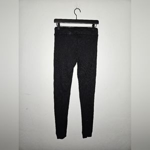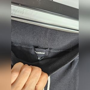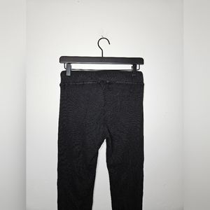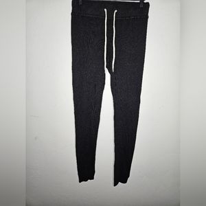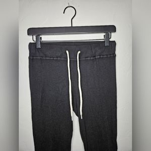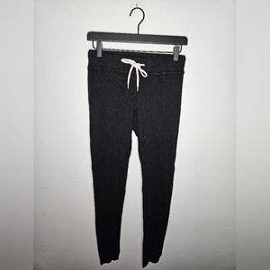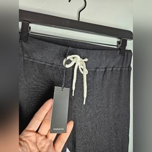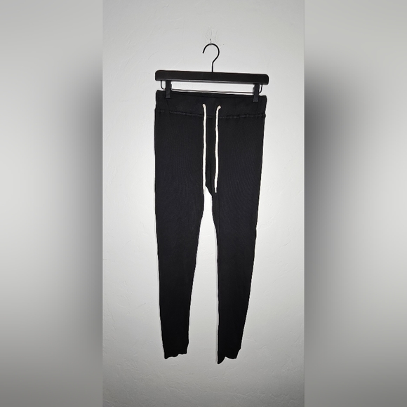 Slim ribbed joggers from Monrow. Elastic waistband with white drawstring. Soft, stretchy knit fabric. Tapered leg for a sleek fit. Easy everyday staple.
