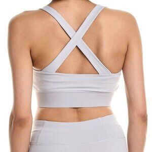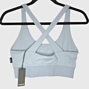 Dusty pale blue workout crop top by Monrow. A high quality workout bra that is smooth and supportive with a crisscross back.