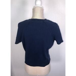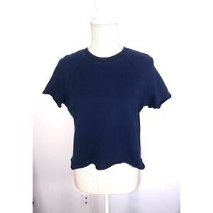 This short sleeve cut-off raglan top is perfect for transitioning. It is a mid-weight French terry, much like sweatshirt material. It comes in a gorgeous navy color that is easy to dress up or down, depending on your style. The raw hem gives it extra style. New without tags, purchased from a sample sale, and tags were removed to prevent return.