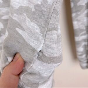 Monrow Neutral Camo Crewneck Sweatshirt. Soft and cozy crewneck with allover grey/white camouflage pattern. Finely ribbed hem, cuffs, and neckline. Fabric content: 0% rayon, 27% cotton, 3% spandex (per Revolve website). Stitches loose on one seam (see photo), otherwise very good preowned condition.