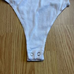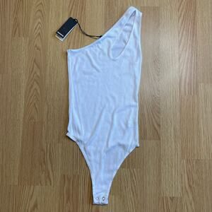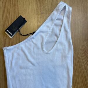 New with tags white one shoulder bodysuit from Monrow, size XS. Super soft and stretchy supima cotton and micromodal blend makes this ribbed bodysuit lightweight and breathable for wearing on its own or layering. Thong back with snap closure.
