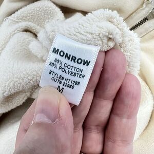 This Monrow sweatshirt in off-white is a cozy addition to your activewear collection. The long sleeve pullover has a zip closure and reversible design. It features side zips and is made of a mixture of polyester and cotton with a fleece fabric type. The size is medium and it is suitable for women. The brand is Monrow and it is a regular size type. It is perfect for a casual day out or for your workout routine.