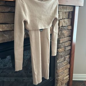 Contemporary rib-knit sweater dress with a stylish overlay that creates an attractive triangle cutout in the front.
