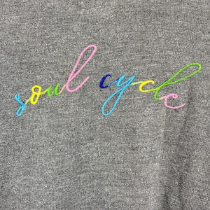 Monrow + Soul Top Womens Small Gray Soul Cycle Henley Long Sleeve. Thin knit top. Multicolor Soul Cycle graphic embroidery. Ribbed Neckline, cuff and hemline. 62% Rayon, 32% Cotton, 3% Spandex,3 % Polyester. Pre-owned Condition- no flaws, no rips, stains, or holes.
