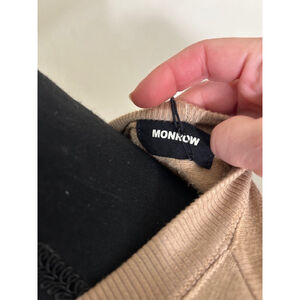 New with tags Monrow Supersoft Fleece Sweatshirt with cut-out shoulders. The Latte colored sweater is size small and made of polyester, cotton, and rayon. Features include long sleeves and a crew neck.