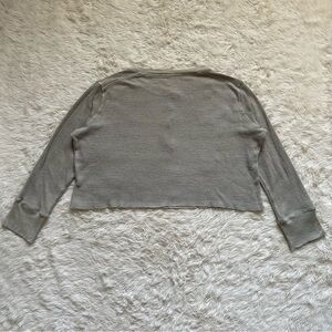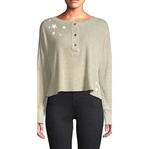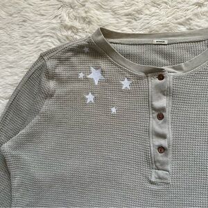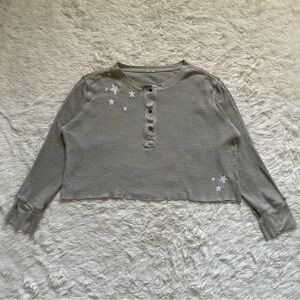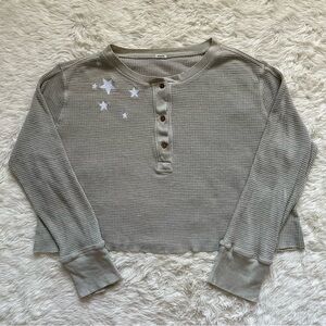 Monrow Top Oversized Crop Henley Thermal Shirt Star Embroidered Long Sleeve S