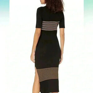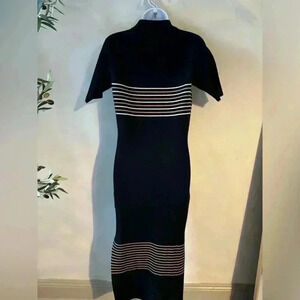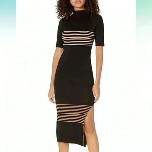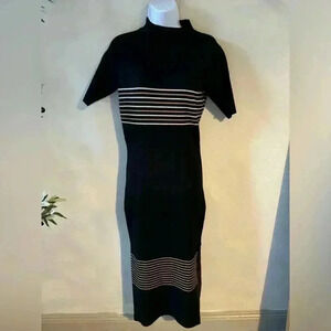 This fitted Supersoft sweater knit stripe dress is beautifully made. It has a midi length with a slit on side, mock neck and 3/4 sleeves.