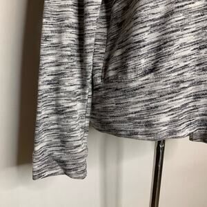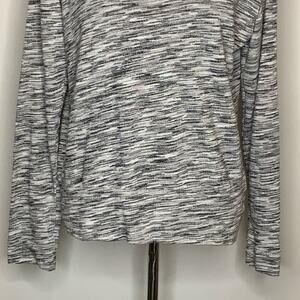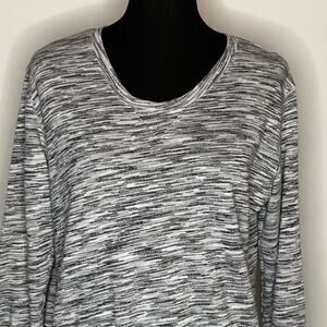 Monrow black and white marled knit sweater top. Slight scoop neck. Pullover style. Banded hemline. Size L. Excellent preowned conditon. 46% polyester 27% cotton 27% modal. Machine wash.