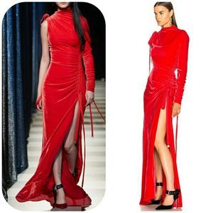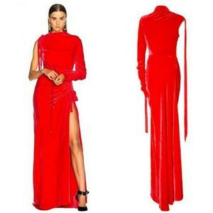 This luxurious velvet Monse gown is cut in an asymmetrical silhouette and trimmed with woven ties at the long sleeve and side seam. Hidden side zip and hook-and-eye clasps at the shoulder. Lined. Fabric: Velvet. Shell: 82% rayon/18% silk. Lining: 100% silk. Dry clean. Made in the USA. Measurements Length 1: 50”,from shoulder to front hem Length 2 60” from shoulder to back hem armpit to armpit 18”, waist 14.5”, hips 18”