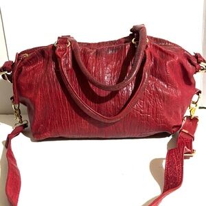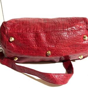 This stylish red leather handbag is perfect for any occasion. Its elegant design and vibrant color make it a must-have accessory.main compartment 3 pockets at interior wall 1 zip closure lining have tear exterior have discoloration hight 12” width 18” depth 5.5” strap drop 9” shoulder strap 26”The dimensions are based on approximately measurements before placing an order please check take a moment to view all photos using feature for a closer look