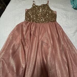 Monsoon sleeveless formal dress. Rose gold pink with sequin top and layered tulle skirt. Very good condition. Size 11.