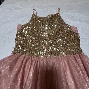 Monsoon sleeveless formal dress. Rose gold pink with sequin top and layered tulle skirt. Very good condition. Size 11.