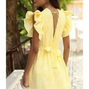 Beautiful and unique handmade dress by Monsoon and Beyond. Crafted in India with care, this dress features a sunny yellow and white boho print, flutter ruffle sleeves, and a flattering deep V-neckline with a tie-back detail. Perfect for warm weather, vacations, brunches, or summer gatherings.