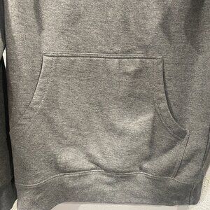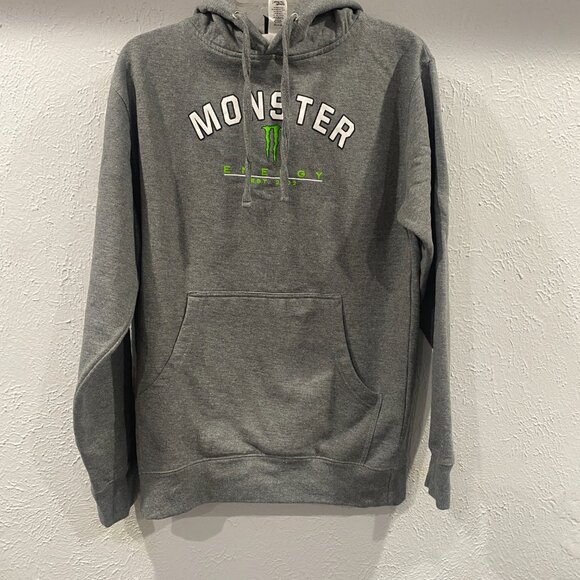 Monster Energy Hoodie with drawstring, in grey with green, white, and black accents, Y2K, long sleeved, 2002, men's size Medium, kangaroo pockets, logo tag on hood, logo across chest and on back left hip area. Pit to pit 19" length 27". No stains or blemishes. NYC 110 box 150
