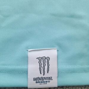 Three button down men's polo t-shirt with monster energy logo, color turquoise, greeish blue, ocean wave color, new in packaging. Comes with a brand logo koozie/can cooler and a metal Monster logo keychain. All new. Monster Energy fans.