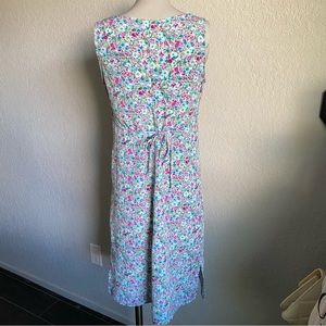 Blue with purple flowers. Empire waist that ties in back. Slits on either side of the dress. Brand was sold in 90s Delia’s catalogs. Fits like an XS. No flaws noted.