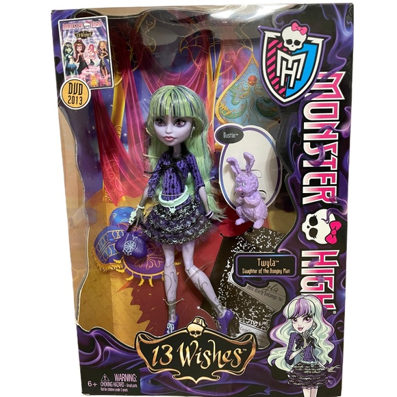 The is a Monster High 13 Wishes Twyla doll in its original packaging. Twyla is the daughter of the Boogey Man and her design is inspired by the Monster High 13 Wishesmovie.