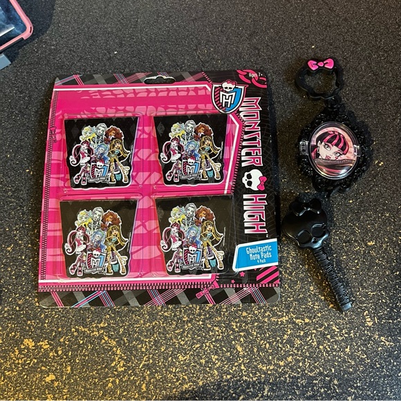 monster high doll bundle which includes a new pack of notepads, a monster high keychain and a hairbrush for the dolls. selling everything together! i also have other dolls and monster high toys listed :)