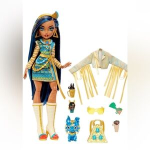 Bring home the fierce fashion and royal attitude of Monster High with this Cleo de Nile doll! Dressed in her signature blue and gold outfit, she comes with all her original accessories—including her statement jewelry, shoes, and her adorable pet dog.