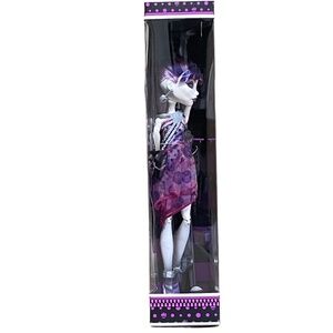 The Monster High Dot Dead Gorgeous Spectra Vondergeist Doll by Mattel from 2011 is a collector's item featuring a purple-haired, blue-eyed girl doll with a light complexion. This fashion doll stands at 11 inches tall, comes with detachable parts and remmovable clothes, making it an articulated and interactive toy for fans of the Monster High franchise. The doll is part of the Gothic & Horror theme, perfect for all ages, and comes in its original unopened packaging. Made of vinyl and plastic, this original piece is a unique addition to any doll collector's assortment.