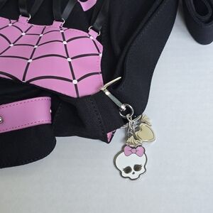Stylish and edgy, this black and pink shoulder bag features a unique spider web heart design. Perfect for adding a bold statement to any outfit.