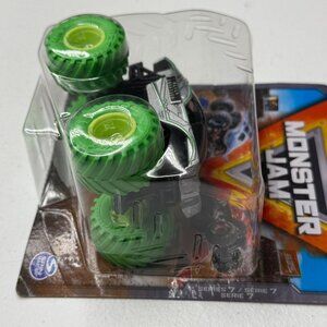 Official 1:64 scale true metal truck featuring bright green wheels and silver alien-themed body graphics. Part of Monster Jam Series 7. Brand new and factory sealed on card.