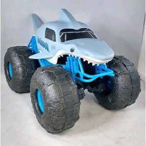 The Monster Jam Megalodon Storm RC Monster Truck by Spin Master is a 16" blue plastic toy with no remote, part of the Hot Wheels Monster Jam series. This toy is suitable for boys and girls and features a Monster Truck theme. The model, Monster Jam Megalodon Storm, is a contemporary manufacture from the year 2020. Made by Hot Wheels under the Monster Trucks brand, this toy is perfect for young fans of monster trucks looking for a fun and imaginative playtime experience.