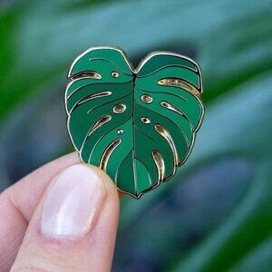 This is a high-quality and well-detailed enamel pin of a Monstera Leaf. There are two clasps on the back for securing the pin and preventing rotation. Each pin is about 1.2" inches tall and is packaged on its own meaning card. The pin and meaning card are further packaged in a clear plastic sleeve. The base metal is zinc alloy and is plated with gold. This is a Grade A Pin, the highest grade awarded to pins, meaning that it doesn't have any noticeable flaws.
